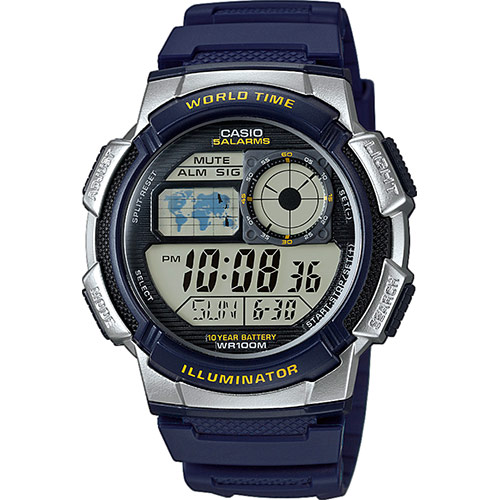 Reloj Casio para adultos y niños, apto para nadar, y con funciones como alarma, calendario, luz (iluminator) y el uso de horas de distintos lugares del mundo.